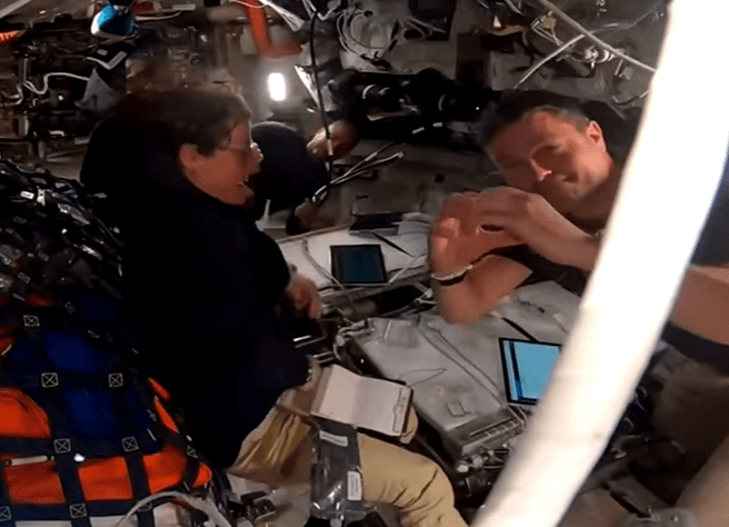 Artemis II crew shares an emotional embrace after surpassing Apollo 13’s long standing record on traveling farther from Earth than any other human in history. Screenshot taken from NASA Official YouTube Channel.