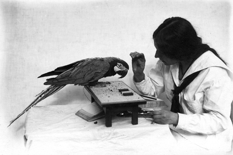 In the photo below, which is part of the photographs at the Darwin Museum, we can see Nadia working with a macaw. The parrot sits opposite her on the table, while Ladygina-Kohts held a small food reward in one hand and a pencil in the other, scoring its choices as she tested its ability to discriminate among objects.